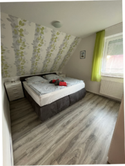 Das Schlafzimmer ist ausgestattet mit einem Doppelbett, Nachttischschränke und Kleiderschrank